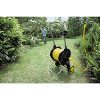 Carro portamangueras de gran movilidad con gancho de almacenamiento y soporte de accesorios. Con horquilla de desplazamiento de altura regulable, casquillo roscado de conexión flexible, manivela libre y una innovadora función de plegado.