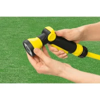 La pistola pulverizadora multifuncional es especialmente adecuada para regar diferentes plantas con diferentes requisitos. La pistola rociadora multifuncional también cuenta con 3 patrones de rociado: Chorro de ducha, puntual y cónico. Los macizos de flores y plantas se pueden regar fácilmente (ducha y chorro cónico), y las terrazas o muebles de jardín se pueden limpiar de suciedad gruesa (chorro puntual). Esto hace que la pistola pulverizadora multifuncional sea perfecta tanto para tareas de riego como de limpieza. La pistola rociadora también cuenta con el gatillo bloqueable en el mango, lo que garantiza un manejo cómodo y un flujo de agua constante. Usando la válvula de control ergonómica, que se puede operar con una mano, el flujo de agua también se puede adaptar según los requisitos. Por cierto: las boquillas de Kärcher son compatibles con todos los sistemas de clic disponibles y se pueden conectar a su manguera de jardín sin ningún problema.